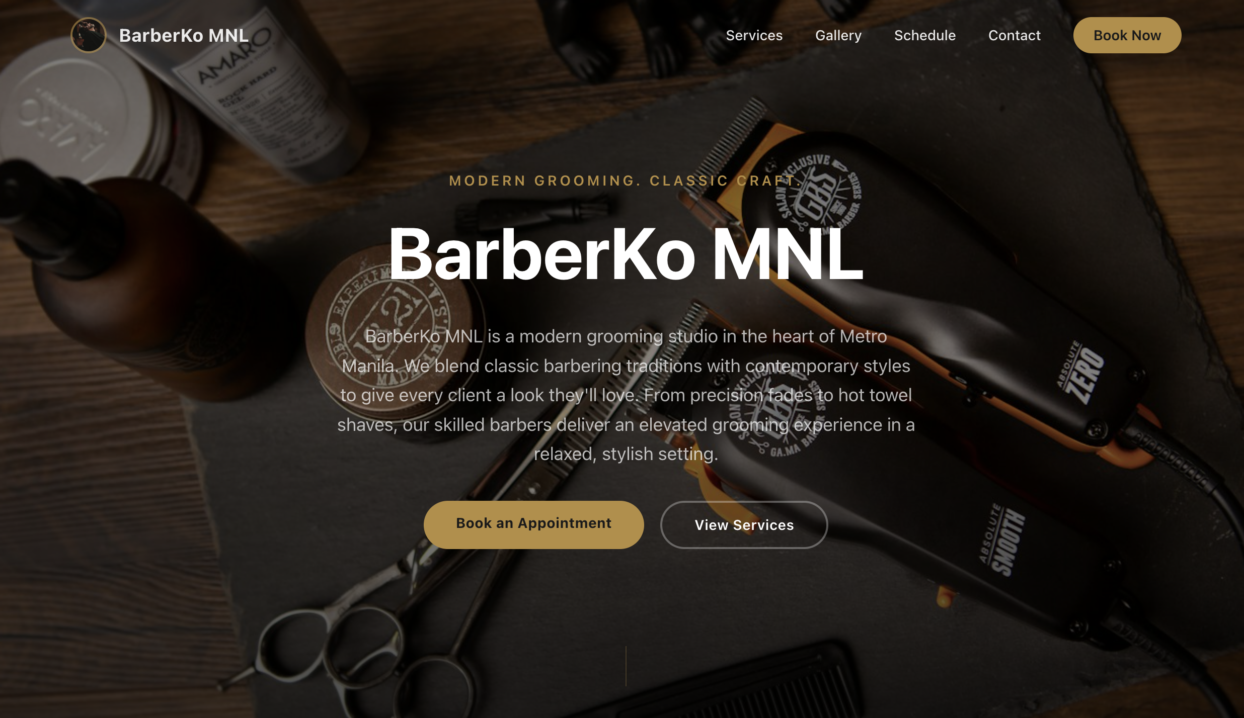 Premium grooming/barbershop template with services & pricing, gallery, schedule, testimonials, and customizable colors.