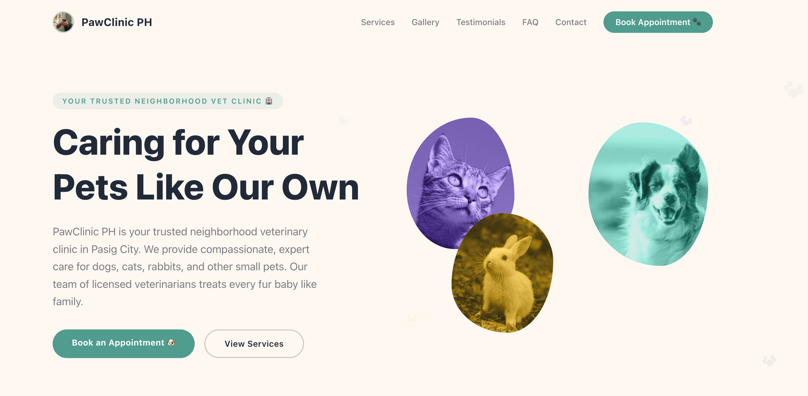 Playful veterinary clinic template with colorful pet blobs, FAQ accordion, signpost features, size-based pricing, gallery, and customizable colors.